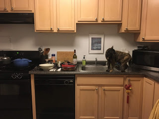 I am also going to tell you that cooking is complicated by the revelation that my ten-year-old cat has a new proclivity for jumping on countertops.