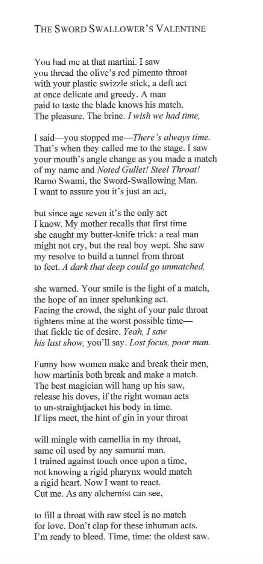 For me, the litmus test is those first two stanzas. If I can place the end words first voluntarily, then as directed by the form--if I justify the reflexive moment, transitioning between stanzas 1 and 2--I get excited. Here a conversational mode facilitates the required echo of "time." I still haven't figured out the central conflict: yes, his job might be a deterrent to dates. Yes, there might be humor in tracking how a child trains to become a sword-swallower. But what's the real-time risk going to be?