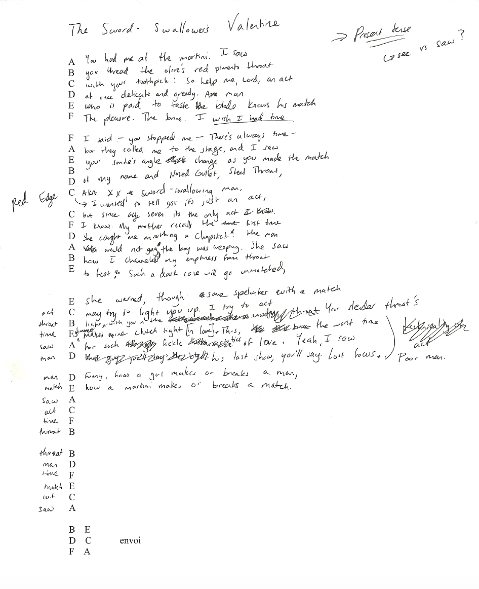 After a lifetime of avoiding bloodshed, the speaker now craves this sign of vulnerability that is embedded in love. Stanza 5 re-harnesses the power of endstops. That elusive "oil," which proved unwieldy as an endword, gets a chance to appear. (Only after I spend an afternoon researching the art of sword-swallowing, and discover that the camellia oil on the blade is borrowed from samurais.) "Saw," the first word I scribbled before this was even sure it could be a poem, is also where I get to land. I've probably read the poem aloud twenty of thirty times at this point, as part of the revision process. What interests me about the form is the push-pull between the control you have (choosing end words) and the control you surrender (the narrative spun out by those end words). This poem is one of six sestinas that appears in Count the Waves. I ultimately obscure the stanza breaks, because I want it to read like a dramatic monologue. That version can be found here. I'm glad to look back and be reminded of how I found my way from draft to draft. I'm grateful that a poet walked out of my office ready to tackle her own sestina. Though I am 1,253 miles away from my husband, that's all the valentine I need.