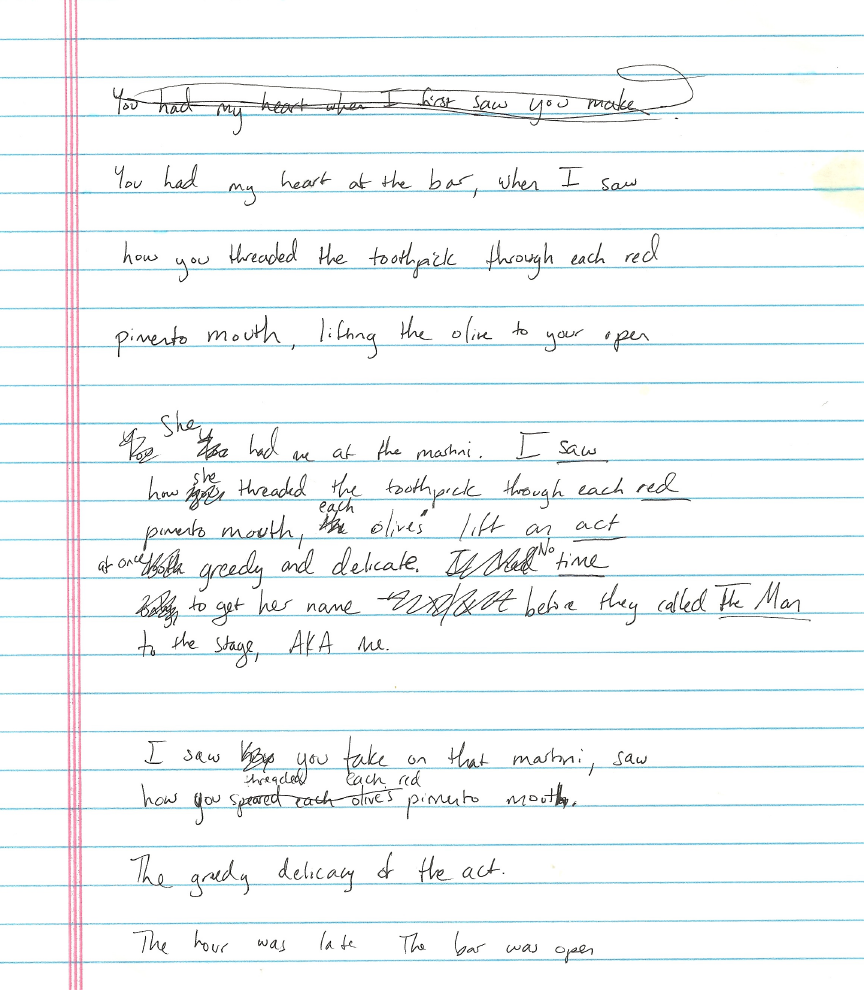 Out of this play, one image had arisen: a martini with one of those inexpensive cocktail swords. Did that mean this poem would be set in a bar? Not necessarily, but I was in the setting of a bar when I picked up my drafting a few hours later.