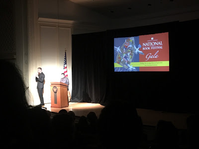 Newly appointed Librarian of Congress Carla Hayden got a hearty round of Woooo from the crowd. The speakers included Edwidge Danticat, James Gleick, and Marilynne Robinson. I've been in the Library of Congress's Jefferson Building for a dozen receptions, but never anything quite like this. There were stations for shrimp and grits, mini-tacos with five different salsa, peking duck rolls and pork buns. I was allergic to all of it, but happy to get another Moscow Mule with a red-and-white striped straw. A few members of the catering staff had been recruited to re-enact the gondola pose from this year's NBF poster for a tableau set up in the middle of the room.