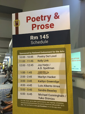 I read right before Michael Cunningham and Yuko Shimizu. I was touched by the presence of familiar people in the crowd--Rob from LOC, Amy Stolls of the NEA, former students, friends from MFA days and from local literary organizations, fellow DC poets, many of whom have heard me read before and who had so many fancier options of places to be in that moment. I hope I remembered to thank all of them. I thanked Karen. I thanked my husband. I thanked the woman holding up the timecards. I did not thank Siri, who at one point attempted to chime in on the reading. I thanked the ASL translator who dealt with signing "word splooge" on the fly.