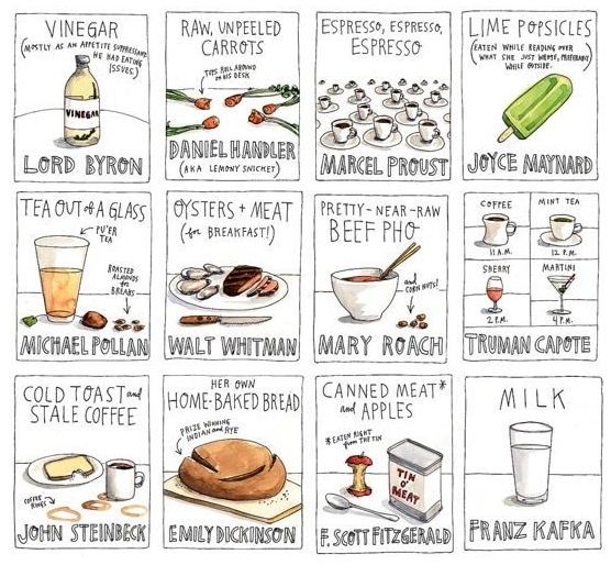 The above illustration by Wendy MacNaughton appeared in a 2011 New York Times Book Review as "Snacks of the Great Scribblers." I was reminded of it by Leslie Pietrzyk, a fellow low-res teacher, DC-area writer, and blogger. Check out "Works-in-Progress," if you have not already--her latest post is a great discussion of strategies for revision. Leslie also edits Redux ("Work worth a second run"), an online literary journal devoted to posting things that originally appeared in print only.