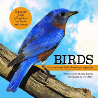 This very educational book provides an up-close look at 13 different North American birds. For each bird, Raines provides a poem, some facts, and descriptive information about the birds habits and behavior. Some poems are simply melodic while others add to knowledge of the particular bird or offer insights into the bird's personality (Blue jay, blue jay / strut your stuff!) The photographs are clear and near-life size or over sized. The book itself is large and square, making it easy to share with groups of children. The last three pages of the book are devoted to "story stretchers" designed to provide lessons and activities about birds in general or specific species. For example, a science stretcher asks children to explore the habits of hummingbirds while a listening stretcher explorers bird sounds.