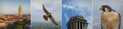 Photo collage courtesy of UT-ACheck out the newest "Longhorn" at the University of Texas! "Tower Girl" swoops around campus before returning to her nesting box where she can be viewed by the world thanks to the school's falcon cam. The fastest bird, and one of the fastest animals, on the planet, Tower Girl feasts on the many doves, pigeons, and grackles on campus. Austin, TX is at the outer edge of peregrine falcon breeding territory. The male falcon visits in late winter and early spring so we may see some action here. Click the link to open the cam: Falcon Cam