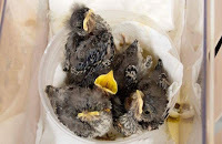 Baby Mockingbirds (photo by Deb Davis Nevin)While this is a perfect read aloud that will have children reciting along, it also does have some good information on nest building for young birders right as nesting season starts. And the illustrations of baby birds waiting to be fed is spot on: they are all bright yellow mouth!Parents and teachers should also visit Fleming's website for activities related to the book, including a really cute baby robin mask that will have the kids looking like baby birds. There is also a teacher's guide available.