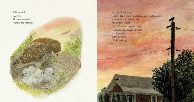 I love when a picture book gives you a little window into the story on the jacket and title page.In the beginning, if you look closely, Hawk Rising shows two birds sitting in a tree near a house. The next two pages are filled to overflowing with the Red-tailed Hawk family sitting in their nest. As the story progresses, Gianferrari and Floca tell and illustrate the ways that a girl and her younger sister rising in the morning mimic the birds awakening for the day. Stretching, waiting for breakfast...and we then see Father Hawk searching for breakfast for his chicks. "He leans--then dives." Some prey is safe, shielded by branches. Others drive the hawk away. Finally, towards the end of day, Father Hawk grabs a squirrel and, back in the nest, "Chicks screech and jostle, no longer waiting." Everyone has eaten and is safe in bed for the night, awaiting the next day.