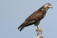 Red-tailed Hawk (image used under license from Creative Commons)Hawks of various types are frequent visitors to backyards and wooded urban settings so it's fairly easy for young birders to see them. It's harder to actually identify them or photograph them so Hawk Rising offers an excellent opportunity for up-close study. Red-tailed Hawks are large, almost eagle-sized, with broad, rounded wings and a short, wide tail. As with many species, there are color variations but most Red-tailed Hawks are brown above with a pale, streaked belly. The tail is pale on the bottom and cinnamon-red on top. When they flap their wings it is a heavy beat. They often sit on poles and high fences in open areas and they are magnificent to see!