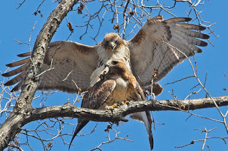 Seems that a red-tailed hawk has been servicing three females in Tompkins Park in New York City. Now he's had two chicks with one of his mates and is now working feverishly to feed them. Click the link to read the tale. Links in the article lead to other articles about the Lethario and the cheep lady hawks he has taken up with. Apparently he has been quite prolific in sharing his DNA! Wildlife photographer Laura Goggin has posted more photos on her site, including some of the babies and more about the love triangle.