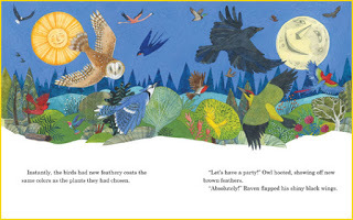 We learn that originally birds had no colors, and in fact, had no feathers at all. Upset because the lack of feathers meant they were cold in winter, the birds appealed to the wise full moon. Realizing that the birds needed help, the full moon told them what to do. Unfortunately Peacock was buried deep in the leaves and did not hear the instructions. So while Flamingo turned bright pink, Duck got green and brown feathers, and Raven found shiny black feathers, Peacock missed out. Knowing that they could not leave him like that, all of the birds offered one of their feathers to Peacock. Peacock's body was suddenly a jumble of colors, but moon helped him arrange them into a "clear, colorful pattern." When Peacock spreads his feathers he is "showing everyone how beautiful kindness can be."