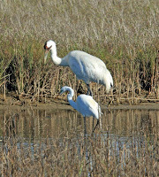 Whooper and egretPhoto by Kevin SimsNearly five feet tall, the whooping crane is the tallest bird in North America. Their wings span 7.5 feet across. (The photo by Capt. Kevin Sims shows a whooping crane with a great egret for size comparison.) They are white with reddish-rust patches on the top and back of their heads. Black areas on their primary feathers are visible only in flight. But the most amazing thing about them--well, one of the most amazing things--is the migration. These magnificent birds spend the summers in northern Canada and migrate 2,500 miles to Aransas National Wildlife Refuge near Rockport, TX for the winter. This is the only wild, self-sustaining migratory population of whooping cranes in the world! (There are occasional "vagrants" that show up elsewhere along the Texas coast. One was reported in Brazoria NWR in mid-November and caused quite a stir while he played with the sandhill cranes in the area for a few weeks before moving on.) They migrate during the day, stopping at night, so they may also be seen briefly along the migration route.