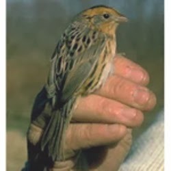 Le Conte's Sparrow (USGS photo)Ah, ah....it's a Le Conte's Sparrow! One of the most easily identifiable birds, according to Audubon. But wait, the beak is wrong. Sparrows have conical beaks while the bird I saw has a longer dagger-like beak. So I'm pretty sure this is not a Le Conte or any other sparrow. Back to the guide books.