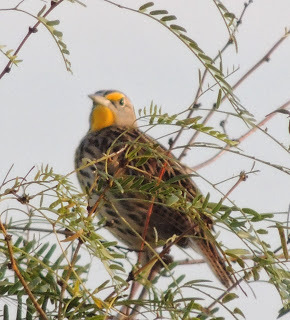 Trying to learn, I looked at images of the Eastern Meadowlark. Field marks include a black patch or V on the breast, which if it appears on my bird is very very faint and streaked (indicating a juvenile bird). The illustrations in Sibley's are more similar to my bird than I see in the photographs on websites like WhatBird.com, where the birds look brighter and more yellow. To add further to the debate, given the region of Texas where this bird was seen, it could be a Western Meadlowlark. The only discernible difference is their song. The Eastern Meadowlark trills, "see-you-see-yer" while the Western croons "shee-oo-e-lee shee-ee-le-ee." Got it? Me neither. This isn't much better than chemical differences between monkeys!