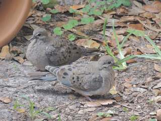 watched it, assuming it might be hurt, and also kept the dogs away from it. After getting a photograph and watching the bird, I realized it was an immature bird and could fly but was content to stay under the bush and in the rocks. The next morning the bird wasn't under the bush and I figured it had flown away. But then I walked into the far back of the yard and two birds were sitting near the tool shed. They've been hanging around for several days now, clearly feeling safe in spite of Daisy and Indigo's curious looks.These two are mourning doves, one of the most common birds in North America. Their long pointed tails are unique among North American doves, of which there are about 15 species. The mourning dove is the only native Texas bird that occurs in all 254 counties and, interestingly, is the only dove species found in Canada, although there are 300 species world-wide. Hunted for sport, more than 20-45 million are killed annually, although they reproduce enough that they are not in danger of disappearing. More than 350 million are estimated in the US population. (I learned how scientists count birds and it's very interesting but that will be another posting.)