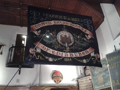 This raises all sorts of questions. Were the stone throwers in favour of the criminal, or aiding the deliverance of justice by showing their anger at the wrongdoer, or did they enjoy it as empowering entertainment? A mixture of all of the above, I suspect! In my reading on the Scottish witch trials I discovered that in one instance the villagers stoned an accused woman then trampled her body to death beneath a wooden door, such was the fear and persecution surrounding "evil" witchcraft. I used these images in part to describe the death of the Taskill's mother, which was also the moment when the three siblings (Jessie, Lennox, and Maisie,) were torn apart.In the upper galleries at the People's Story there are many flags and banners that show how important the workmen's guilds were. In order to gain a voice and rights, different tradesman gathered together. Here is a flag from the brush makers of Edinburgh, for example. In THE LIBERTINE, one of the sub plots follows the hero, Lennox Taskill, trying to establish his men as the official cart and carriage makers of Saint Andrews. Many of the local townsmen are against his application because of the rumours that Lennox and his people practice witchcraft.