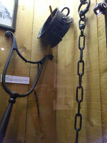 Objects from law and order in the 1700s are shown below, including shackles, a neck brace, and the rather disturbing thing that looks like a pitch fork with a closure was used to capture criminals on the run, presumably around the neck from behind. Eeek.