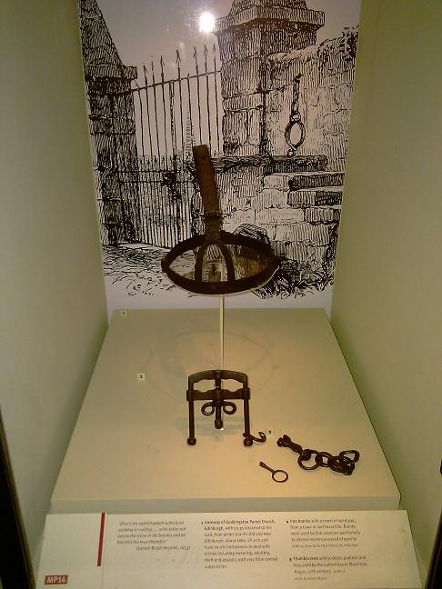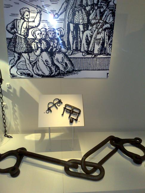 In the photo below you can see another set of thumbcrews with padlock and key, and iron branks with a gag - an item used by the Kirk particularly to silence women accused of gossip. Nice, huh?