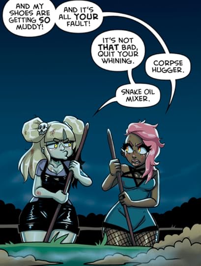 Grave digging attire.As a playful, lighter fare, Death Nell can be placed in a similar camp of monster-school stories such as Nicholas Doan and Gwendolyn Dreyer’s Monster Elementary, the Monster High media franchise, and even the prequel film of Monsters Inc., Monster University. Death Nell’s art reflects its comedic tone, as the colours are vibrant (the fun gothic colours of purple and black) and the characters realized in an anime/manga-inspired fashion (drool, bonks on heads, pursed lips, etc.). The women of Death Nell do adhere to a specific type of depiction: eye liner as big as bats and hips as thicc as gravestones. It’s a fun style that juggles sexy and cartoonish – Hot Topic patrons will definitely approve (and mimic!).