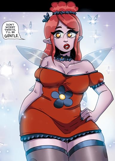 Nell, her undead cat, and April.The titular Nell is a twenty-two year old student at the Deus Mortem school for necromancers where she spends her time sleeping during class and fantasizing about her teacher, Professor Reinhart, instead of paying attention. At the suggestion of her best friend, April (who is a half troll), Nell visits the buxom school nurse (curse lifter?) Madame Flowers. It turns out that Nell’s sleeping issue is from exhaustion due to her insatiable desires despite a regime of self pleasuring. An alchemy spell later and the root cause is discovered: Nell is part Succubus and she needs to om nom nom on the sexual energies of others. Thankfully there happens to be a party coming up that promises lots of action…