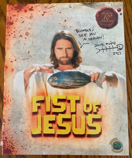 Only 15 minutes long, I gave it a quick watch. It was funny: Dead Alive with Jesus. I’ll be doing a proper write up later (maybe for Easter?). The movie can be ordered at the Fist of Jesus website.