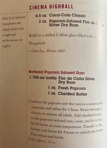Corresponding artwork for the Cinema Highball.However, one might do a double take of the recipe on page 90 for the Cinema Highball: a rum and Coke variant made with movie theater buttered popcorn infused rum.