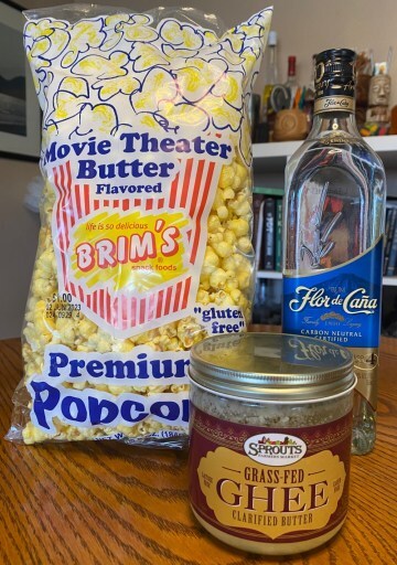 Popcorn, rum, and ghee.If the Flor de Caña sounds a little pricy to be used in this fashion go with a Bacardi Silver, that way if the end result isn’t successful a nice bottle of rum wasn’t squandered.