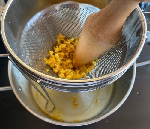Close to an hour grab a sieve. A big one. Put a bowl under it to capture all the rum that will be pressed through.