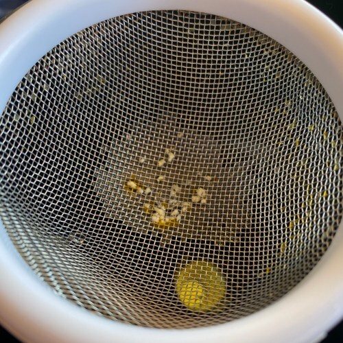 Dump the pitcher of popcorn rum into the sieve and use the sieve-stick to press as much rum out from the popcorn. Don’t press too hard though or the popcorn will actually smoosh through the sieve holes.
