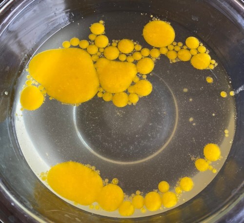 Pour the pitcher into a glass bowl. The ghee will stay floating and congregate into little, buttery islands. Place into the freezer for four hours which will cause the ghee to harden.