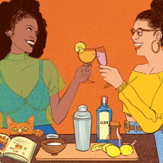 Cropped image of the cheers illustration in Buzzworthy by Rachelle Baker. This piece rules so much. While the illustrations depicting each author are fantastic in their own right, the best art piece in Buzzworthy is the second cat piece that shows two fashionable ladies toasting with cocktails they just made. This illustration is so fun with a few hidden gems in it, such as the aforementioned orange/white blaze kitty peering at an open copy of Buzzworthy which was no doubt consulted by the two women to make their libations. This piece sums up the entirety of Buzzworthy: creating cocktails, honoring (author) women, and having a fabulous time doing so.