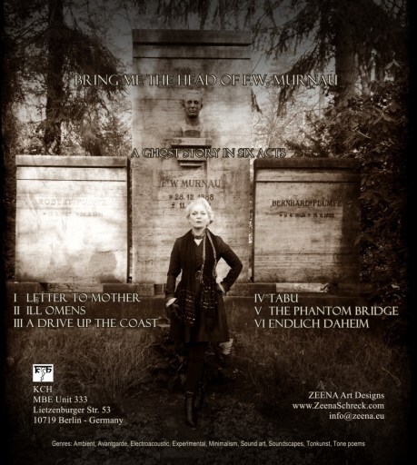 Back album art of BMTHOFWM. Photo of Zeena at F. W. Murnau’s grave by Lance AndersonSo, getting back to the cemetery field recordings: It was only by fluke, while taking photos at Murnau’s grave, that my camera accidentally engaged the video record. It wasn’t until later that day, when downloading my data from the day’s shoot, I realized I’d inadvertently gotten some unexpected and pretty interesting sounds while at the grave. Luckily, there was still time to mix those in before the final edit and mastering. For some unknown reason, I’ve always had strange energy clashes with electronic devices; something’s always malfunctioning with them in my case. I’ve come to expect these ‘accidental’ recordings of environment sounds, with both my audio recorder and my cameras video setting. Whenever it happens, I always discover something interesting, humorous or just uncanny and bizarre that gets added to my sound library. This reveals how much is occurring all the time that we humans normally filter out but which, when cut out of the normal flow of everyday life, can be wonderful auditory meditations. I’m sure that those unexpected sounds at the cemetery made a difference in enhancing an underlying eerie quality to the whole thing.”5