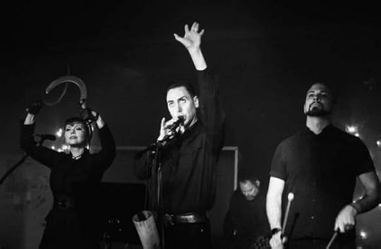 Awen live, 2019. Photo by Karl Hendrik“Morrigan” is an unexpected surprise on The Hollow in the Stone and a tremendous delight. A departure from traditional Awen songs of the past, “Morrigan” is a spoken word track. Awen has come close to flirting with the genre on prior releases in songs such as “Sacrifice” from The Bells Before Dawn, which is more akin to an NSK speech or a Praise the Fallen-era VNV Nation track, and “Dream of an Omen,” which also contains bits of the spoken word formula, yet still feels more like a song than a narration. Instead, “Morrigan” is a narrative, third person perspective, dark fiction, spoken word short story. In the tale, an unnamed protagonist travels though a dark forest with a sinister steed and happens upon the mysterious titular Morrigan at a stream. It is an encounter that will not bode well for the protagonist. “Morrigan” demonstrates that Powell is a master orator, and Awen should consider releasing more songs, or even a one-off album, of narrated stories. As Cadabra Records has shown with their luxurious vinyl releases of readings of H. P. Lovecraft, Clark Ashton Smith, and Thomas Ligotti, there is a niche market for dark spoken word albums set to ambient/industrial soundscapes. Awen, who have repurposed poetic works before (as “Empire, Night & the Breaker” from The Bells Before Dawn which uses the poetry of Breaker Morant) is the perfect outfit to release even more tracks in this vein.