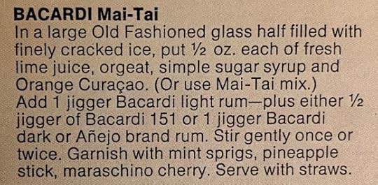 Down to party.There is a variety of Bacardi-centric tiki drinks in the brochure: Bacardi Planter’s Punch, Bacardi Navy Grog, Bacardi Scorpion, and so on. The mai tai is perhaps the most iconic cocktail in the tiki pantheon, so this write up will focus on that specific recipe.