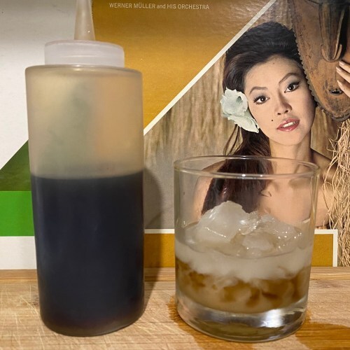 Syrup. Notice the layers.This is followed by .05 oz of simple syrup. Pictured here is rich Demerara simple syrup (2 to 1 ratio).