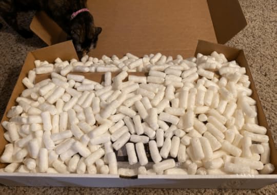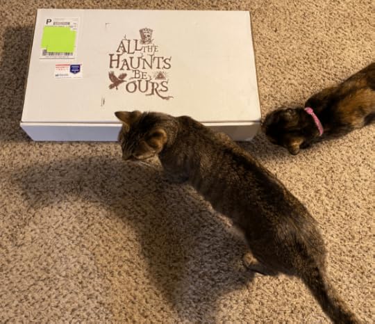Algernon (tabby) and Cecily (tortie). Cats also show scale.Of course, my kitty familiars are intrigued by the parcel and what treasure lie within.
