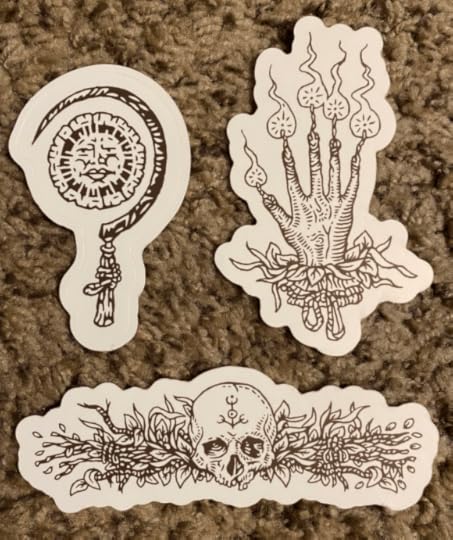 Next up are a set of three stickers with some fantastic art. It’s a shame that special editions like these only come with one set of stickers as folks need at least two: one set to keep pristine and the other to put on things. The top right sticker is a Hand of Glory (as seen in The Wicker Man). The one on the left with the sickle makes me think of the song “The Sickle and the Setting Sun” by Awen.