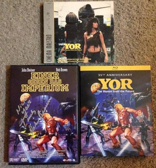 My Yor collection. German version autographed by Reb Brown to me.For January we continued our sword and planet theme by discussing Yor: The Hunter from the Future. The episode can be streamed at BlogTalkRadio. I’ll be taking my notes, compiling them, and turning them into a Peplum Ponderings writeup in February.