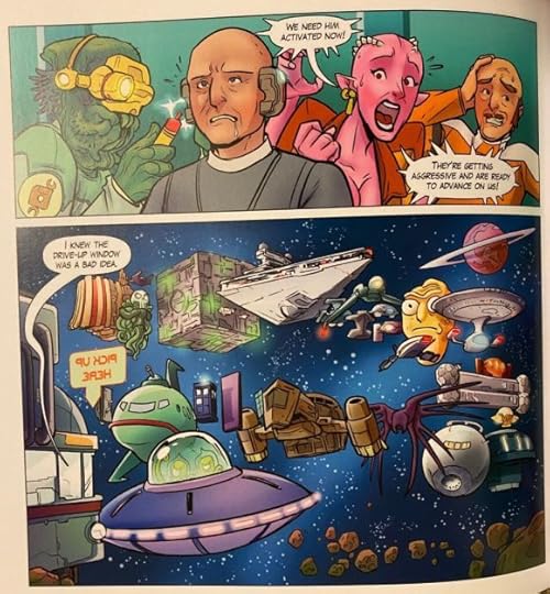 The joke of the page is literally “we need an extra set of hands because there are a lot of vehicles in the drive through” and those vehicles happen to be spaceships from a variety of sci-fi sources (an Imperial Star Destroyer, a Borg Cube, the Satellite of Love, the Normandy, and so on). There is also Lobot, but they stand a drooling mess.