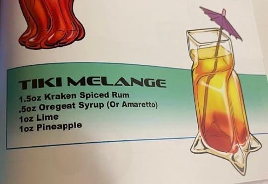 1.5 oz Kraken Spiced Rum.5 oz Oregeat [sic] Syrup (or Amaretto)1 oz Lime1 o PineappleLooking at the ingredients along with the artistic depiction, it is fairly obvious that this cocktail will not work with primitive Earth mixolo-technology and ingredients, but it is a curio and warrants a deeper dive.