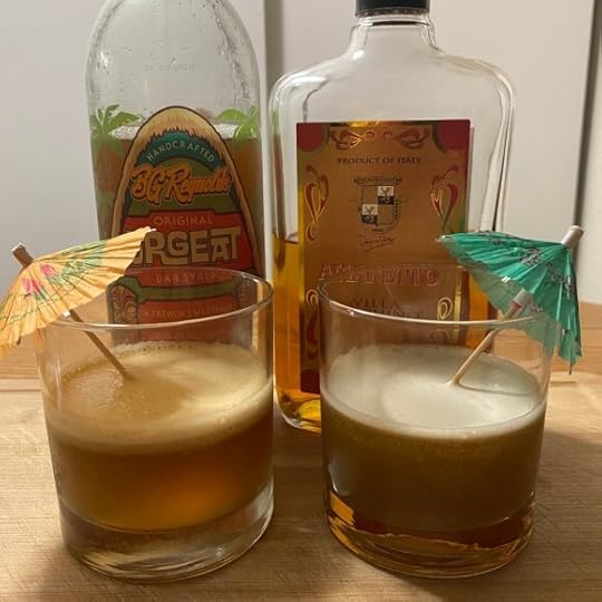 The amaretto Tiki Melange has a white foam, with the pineapple also dominating. This incarnation is more tart than the orgeat incarnation. Both have awful colors and should not be served in clear glassware.