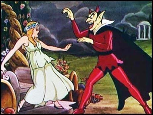 Persephone and PlutoFor example, the depiction of Hades between “The Goddess of Spring” to that in “Hells Bells” is staggering. While both are portrayed as cavernous, full of lakes of fire and denizens who sing and dance, the realm in “Hells Bells” is much more malevolent. In “Hells Bells” there’s actual violent activity as spiders are immolated, snakes feast on bats, imps are fed to Cerebus and the devil character perishes into a lake of fire. Conversely, in “The Goddess of Spring,” there is actually no violent activity. The imps keep Persephone’s elves at bay, but do not attack them. In this version of Hades, no one perishes and no one is tortured. What can be surmised from this observation is that the underworld as pictured in “Hells Bells” is purely for punishment, as per a more Christian perspective, (in alignment with the expected audience), while the underworld in “The Goddess of Spring” leans more toward a realm as the place where souls go to die, distancing itself from Christian hegemony. While places like Elysium and the Asphodel Meadows are certainly not depicted, it would not be farfetched to surmise that they could exist in this incarnation of Hades in “The Goddess of Spring.”