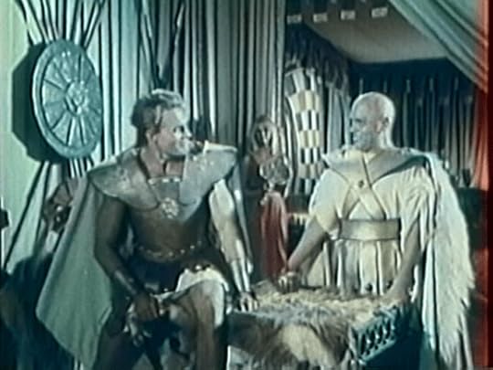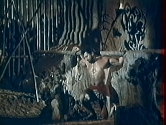 Vulcan captured by the Lizard people.Geo, with the aide of the Tritons, break back into the prison and free Vulcan and the Daughters of Neptune. Vulcan and Aetna make their way to Neptune’s underwater kingdom where Aetna does a belly dance for Vulcan. However her routine is interrupted by Mercury (Isarco Ravaioli) who arrives with the news of Mars’ plan to overthrow Jupiter. Concurrently, Milos’ soldiers capture all the now-freed prisoners and put them to work on Jupiter’s tower construction project.