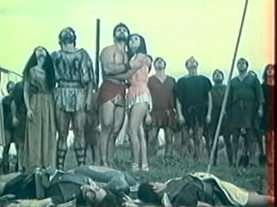 Geo scouting to Milos’ camp.Turning to the humans of the film, Geo is the comic relief character, comparable to Telemachus (Franco Giacobini) fromHercules in the Haunted World (1961). As a little person, Geo is involved in most the of physical gags of the film. Sometimes he is the recipient, such as when Vulcan carries him like a handbag. Other times he is the instigator, such as when he spits waters in the face of Neptune after being resuscitated, and when he makes onomatopoeia noises when clubbing foes when they are down. Aside from the last few seconds of the film when he runs off after Jupiter thunders his proclamations, Geo displays quite a bit of character development, going from cowardly to not. When first introduced he is afraid and wants to be left alone instead of helping the Daughters of Neptune. He opposes being the guide for Vulcan to Milos’ camp and is forced into the role. However by the movie’s end, Geo is involved in two instances of physical combat (once against the cavemen and the other against Milos’ soldiers), and even has a heroic instance of sneaking into Milos’ prison camp disguised as a bush.