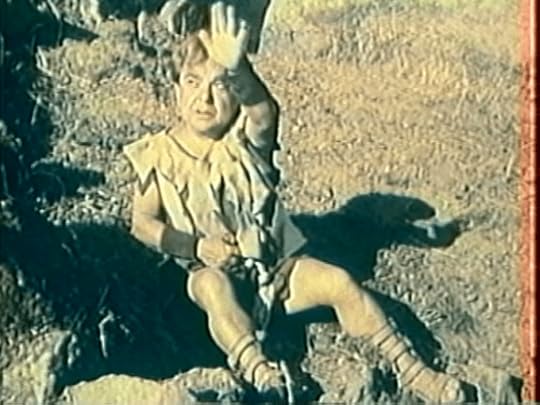 Vulcan battles Mars with a club.While Vulcan may be the hero, he is not particularly likable, a trait he has in common with the other deities of the film. To Geo and Aetna is is especially mean spirited. Regarding Geo, Vulcan laughs at him when he is unable to mount a horse, he carries him like a handbag, and is dismissive of his guiding abilities. To Aetna he treats her with indifference, which he is eventually called out on by Aetna whom he does not even apologize to. When Aetna is being attacked by the cavemen, it is Geo who leads the rescue attempt, not Vulcan.