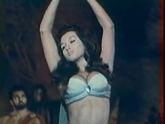 Aetna’s belly dance sequence as Vulcan looks on.Though Venus is the seductress in Vulcan, Son of Jupiter, the film focuses on sexualizing Aetna. Aetna delivers the prerequisite belly dance sequence and numerous times the film focuses on her buxomness (especially noticeable in both the belly dance and when she is jogging after Vulcan and Geo who are on horseback). This specific body emphasis pushes Aetna’s actress, Bella Cortez, into the realm of the maggiorata fisica, placing her in the same camp as Sophia Loren, Gina Lollobrigida, and Anita Ekberg.