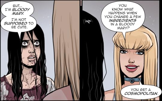 The cast of characters in the second issue is broadened with the introduction of Bloody Mary and Death, providing Becca more opportunities to interact with others, be them living, dead, or undead, providing more venues for comedic dialogue and situations.