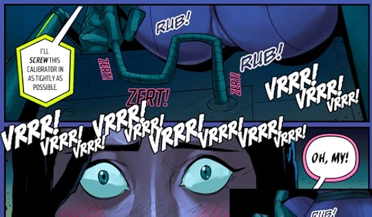 Is GDU-3 an innocent robot who is merely trying to fix the ship who is accidentally getting Carter all steamed up? The bend in his tendril suggests otherwise. Coinciding with the in-panel suggestive antics are innuendos galore as repairing the ship allows for many out of context verbal opportunities such as “I can barely reach the shaft,” “it’s getting harder,” and “Ah yes! It’s in!”