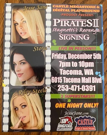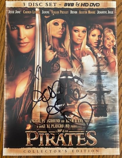 Rest in Peplum Jesse JaneThis past week erotic actress Jesse Jane passed away. Jane appeared in many adult movies, including two pirate porno pepla: Pirates 1 and Pirates II: Stagnetti’s Revenge. Had the honor, way back in the late aughts, to meet not only Jesse Jane, but co-stars Stoya and Riley Steele at a meet and greet: won a raffle and received copies of both of the Pirates films in which the actresses autographed. Here is a mini-slideshow (NSFW images):