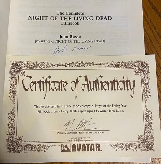 This book popped up as something to order through Previews. The book is actually from 1985. I suspect Avatar Press, which was publishing some NOTLD comics, probably got a box of these books from Russo who has them sitting in his garage and asked for the publisher to sell them. Slap an autograph on them and a certificate of authenticity and voila! Anywho, I liked NOTLD well enough so I ordered this book with one of my previews orders and Richard was able to get it in for me.