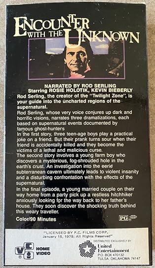 In my essay, I compare and contrast the original run of The Twilight Zone with the 1972 anthology-horror film, Encounter with the Unknown, which uses Rod Serling’s narration and Twilight Zone visual cues to, more-or-less, rip off the legendary series. While I consider the essay exhaustive and complete, I feel it could benefit from an addendum. The final section of my essay, ‘Voices and Images,’ I bring up examples of how VHS releases of Encounter of the Unknown mimic iconic visual elements of The Twilight Zone. While these descriptions are as detailed as possible, I figured readers of the essay would benefit from supplemental material that contains pictures of these VHS releases.